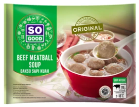So Good Bakso Kuah Sapi terbuat dari daging sapi asli pilihan dan bumbu yang spesial, membuat tekstur bakso garing dan kenyal. So Good bakso sapi kuah dilengkapi dengan bumbu kuah instant, sehingga mudah disajikan menjadi bakso dengan kuah hangat, lezat serta bergizi.