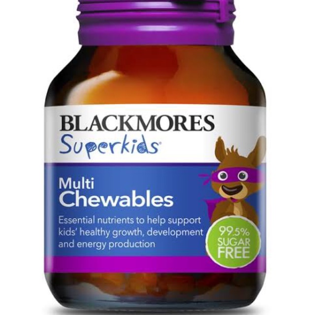 Blackmores SuperKids Multi Chewables adalah formulasi bebas gula 99,5% yang mengandung 18 nutrisi penting untuk mendukung pertumbuhan dan perkembangan yang sehat bagi anak-anak. Mendukung fusi otak yang sehat (vitamin B3, zinc) dan pengembangan (yodium). Antioksidan untuk mendukung perkembangan anak sehat (vitamin C, seng). Membantu mendukung pertumbuhan dan perkembangan normal (vitamin B1, B2, B3, B5, B6, B12, C, D, folat, biotin, yodium dan seng). Membantu berkontribusi pada produksi energi normal (vitamin B3).