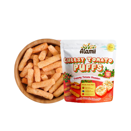 Alamii Cheesy Tomato Puffs adalah cemilan sehat untuk bayi dan anak yang dipanggang dengan 100% buah tomat asli dan tidak menggunakan pengawet serta mengandung minyak bunga matahari yang rendah lemak jenuh