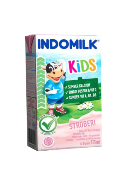 Susu UHT Indomilk rasa strawberrydibuat dengan susu sapi segar yang enak diproses dengan Teknologi UHT (Ultra High Temperature) untuk menjaga kandungan nutrisi penting (Tinggi Kalsium, Fosfor, Vitamin D, Vitamin A, B1, B6, dan Inulin) bagi pertumbuhan anak.