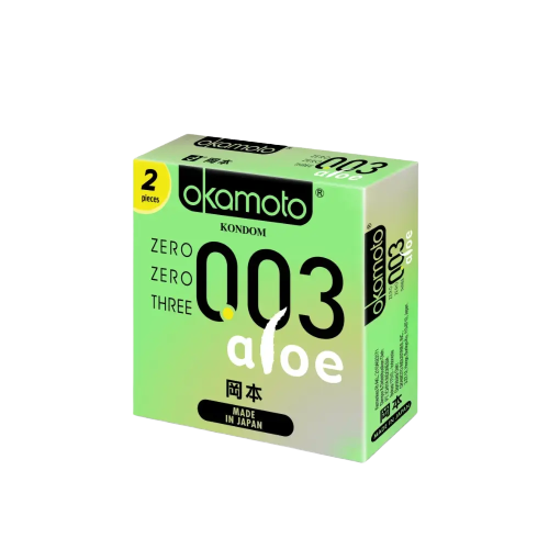 Kondom Okamoto 0.03 Aloe merupakan kondom yang mengandung Aloe Essence yang dapat mencegah terjadinya iritasi dan menjaga kelembapan kulit Anda dan pasangan ketika berhubungan, terbuat dari bahan dasar Latex yang lembut dan tidak berbau karet melain beraroma Aloe Vera yang menenangkan dan tidak mudah bocor / rusak.