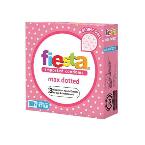 Kondom Fiesta Max Dotted adalah alat kontrasepsi yang merupakan salah satu produk yang memiliki tekstur berbintik yang lebih lebar dan besar dari jenis kondom dotted lainnya.