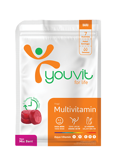 Youvit Multivitamin membantu memenuhi kebutuhan vitamin harian, memperkuat daya tahan tubuh dan memberi energi dengan gummy berry yang enak.