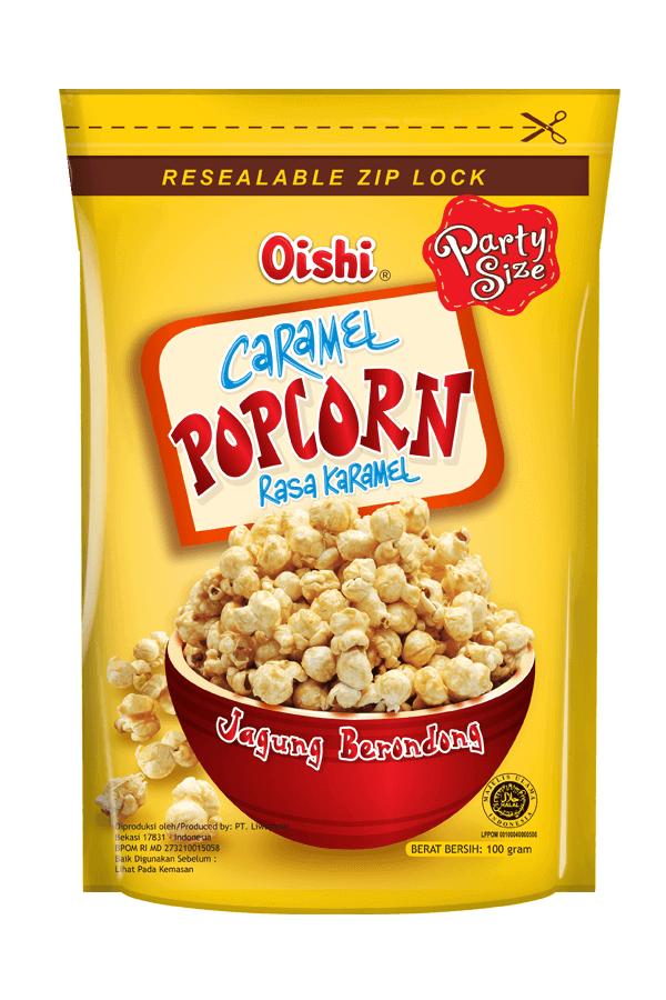 Popcorn makanan ringan yang dilapis dengan rasa Karamel.