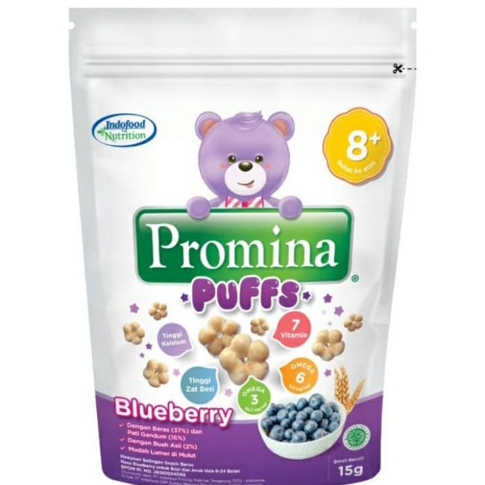 Promina Puffs rasa bluberi adalah snack dari beras, gandum dan buah asli yang diformulasikan khusus untuk bayi 8 bulan ke atas. Tinggi zat besi dan mengandung 7 vitamin, Omega 3 dan Omega 6.
