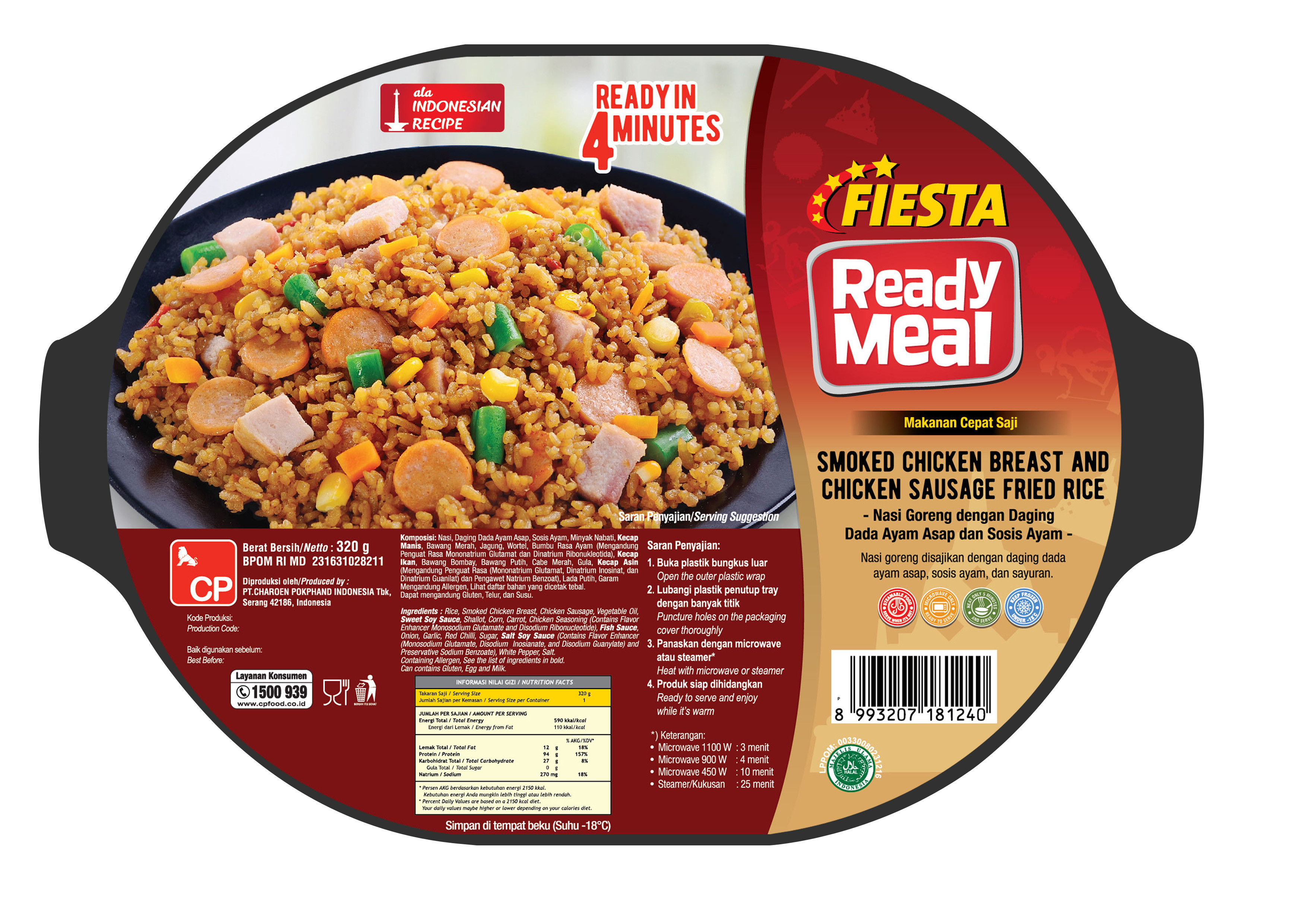 Fiesta Ready Meal Smoked Chicken Breast And Chicken Sausage Fried Rice disajikan lengkap dengan daging dada ayam asap, sosis ayam, dan sayuran.