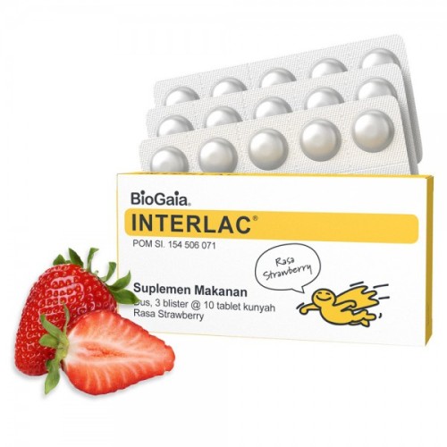 Interlac BioGaia Tablet Kunyah adalah suplemen untuk membantu memelihara kesehatan pencernaan, merupakan satu-satunya produk probiotik yang mengandung Lactobacillus reutri pretectis, Strain probiotik dari BioGaia, perusahaan swedia yang dikenal sebagai World Leader in Probiotics. Interlac telah terjamin keamanannya untuk semua usia dan sudah mendapat predikat keamanan tertinggi, Generally Recognized as Safe (GRAS) dari FDA Amerika Serikat. Interlac probiotik yang telah teruji secara klinis serta aman dan efektif sesuai rekomendasi dokter di lebih dari 90 negara.