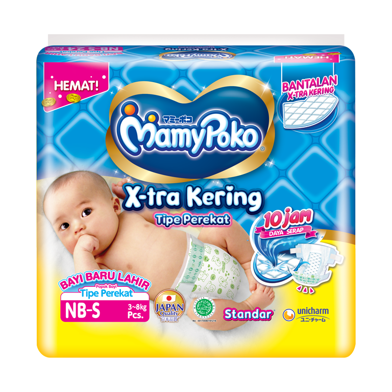 MamyPoko Perekat X-tra Kering menggunakan bantalan X-tra Kering yang akan menyerap pipis berkali-kali dengan 10 Jam daya serap, kulit si Kecil tetap kering sepanjang hari serta mampu terhindar dari iritasi.